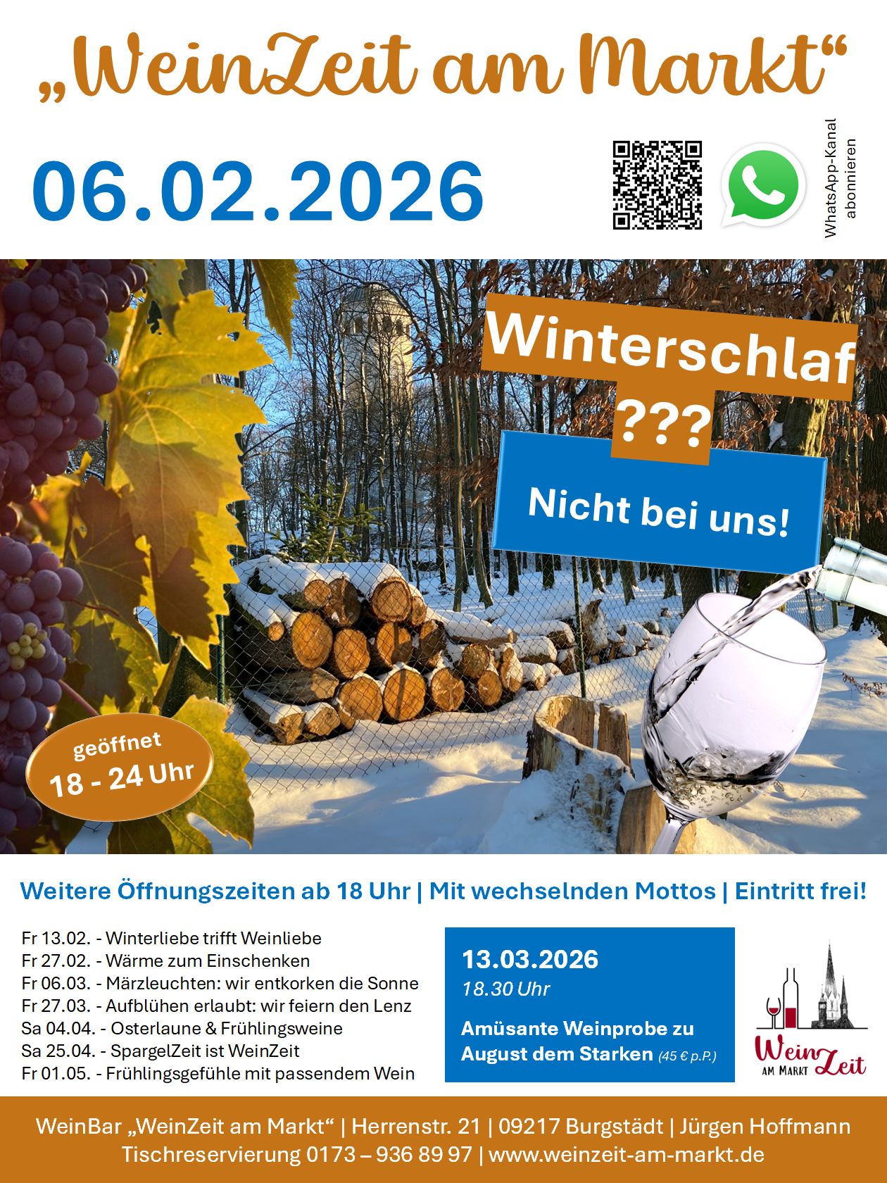 Wenn draußen die Welt in Schnee und Stille versinkt, wird es bei uns lebendig, warm und voller Genuss. Ab dem 06. Februar 2026 heißt es wieder: Türen auf für Burgstädts charmanteste WeinBar! Mit wechselnden Themenabenden, freier Eintritt und geöffnet von 18 bis 24 Uhr laden wir euch ein zu einer Winterreise durch Geschmack, Gefühl und Geselligkeit.