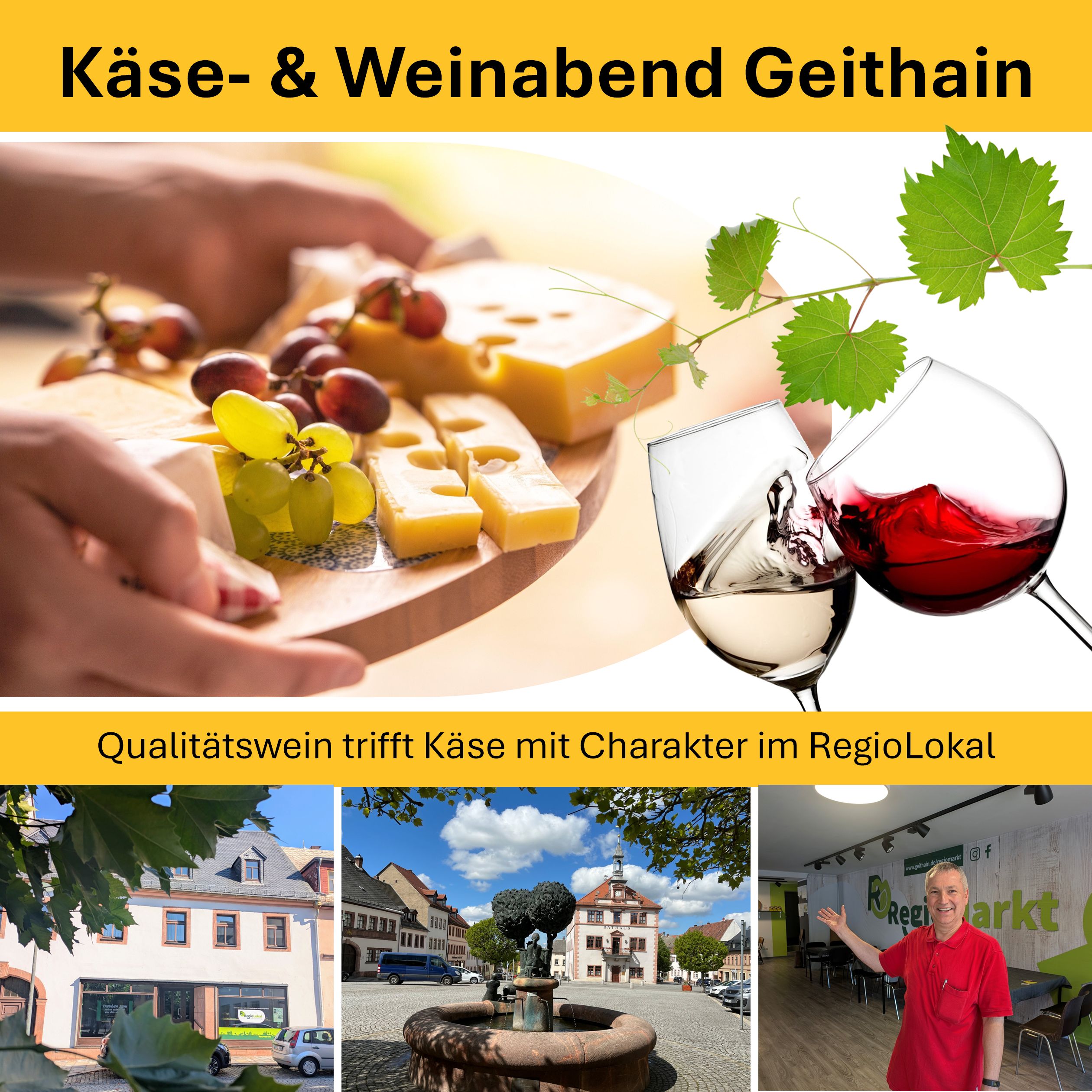 Käse‑ und Weinabend im RegioLokal Geithain: Genießen Sie eine moderierte Verkostung von fünf deutschen Qualitätsweinen, begleitet von abgestimmten Feinkostkäsen. Spannende Einblicke in Herkunft und Rebsorten runden den Abend ab. Mineralwasser inklusive. Ein Erlebnis voller Genuss, Geschichten und Begegnungen. Preis: 45 €.